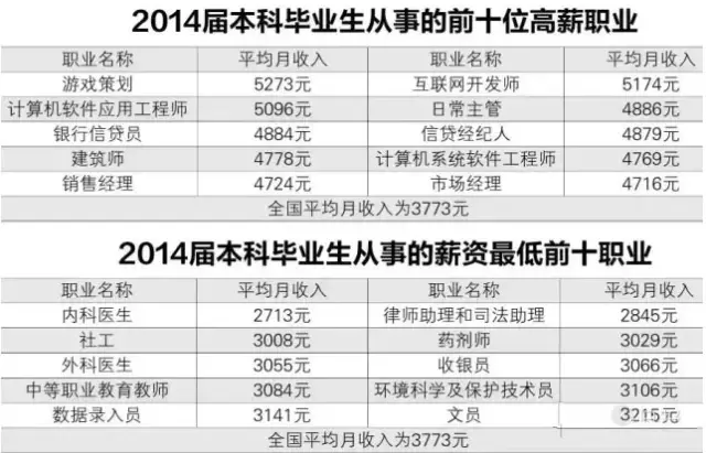 报告显示,游戏策划一职毕业半年后收入最高,平均月薪5273元,内科医生月薪不足3000元垫底。毕业三年后,互联网相关职业仍为高薪,低收入中教师、行政占八成。